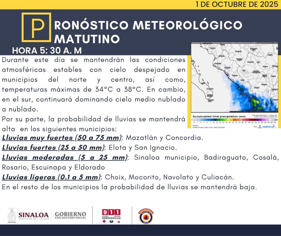 Mazatlán, Sinaloa (RI Noticias). – La Coordinación Municipal de Protección Civil alertó que continúa el pronóstico de lluvias fuertes en Mazatlán para este miércoles 1 de octubre, con posibilidad de acumulaciones entre 50 y 75 milímetros durante la mañana y parte de la tarde.