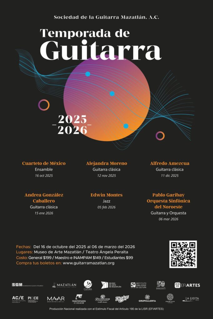 Mazatlán, Sin (RI Noticias).- Mazatlán vivirá la 6.ª Temporada de Guitarra este 2025-2026, la cual se llevará a cabo del 16 de octubre de 2025 al 6 de marzo del próximo año y se realizará en el Museo de Arte de Mazatlán, así como en el Teatro Ángela Peralta