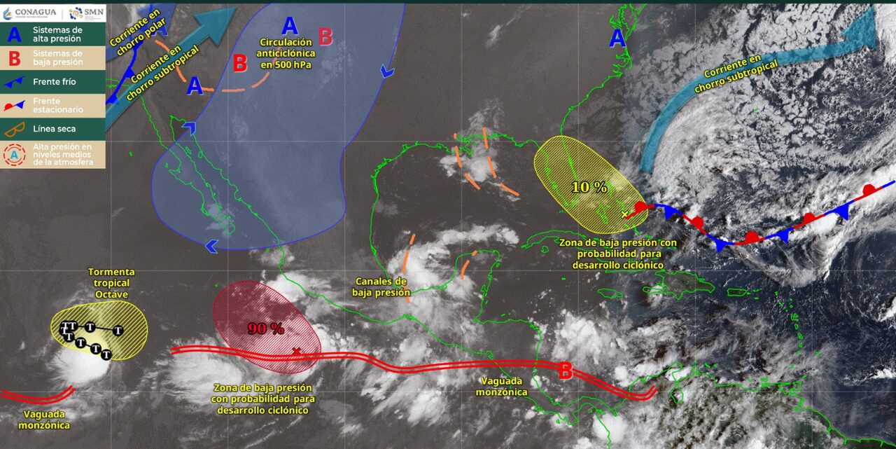 El Servicio Meteorológico Nacional (SMN) prevé para este viernes 3 de octubre de 2025 que la zona de baja presión con probabilidad para desarrollo ciclónico o posible ciclón tropical, se localizará al sur de las costas de Michoacán y Colima, en interacción con la vaguada monzónica que se extenderá próxima al Pacífico Sur y Central Mexicano, generarán lluvias puntuales intensas en Guerrero (norte, este y costa) y Oaxaca (oeste, norte, y sur); así como lluvias fuertes a muy fuertes en el occidente de la República Mexicana.