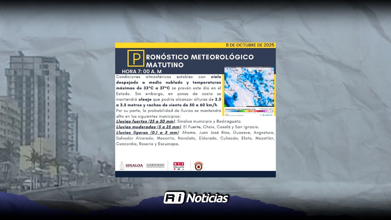 Mazatlán, Sinaloa. – Las condiciones climáticas para el día miércoles prevén cielo despejado a medio nublado, con temperaturas máximas de 33° a 37° grados centígrados; además, la probabilidad de lluvias incrementará en el transcurso de la tarde, informó la Coordinación Municipal de Protección Civil.