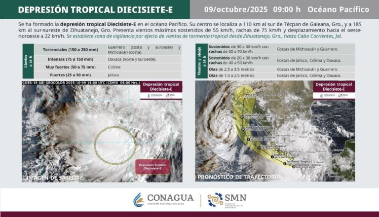 En su reporte de este jueves de octubre, el Servicio Meteorológico Nacional (SMN) señaló que la Depresión Tropical Diecisiete-E se ubica a a 110 kilómetros (km) al sur de Técpan de Galeana y a 185 km al sur-sureste de Zihuatanejo, Guerrero, con vientos máximos sostenidos de 55 kilómetros por hora (km/h), rachas de 75 km/h y desplazamiento hacia el oeste-noroeste a 22 km/h.