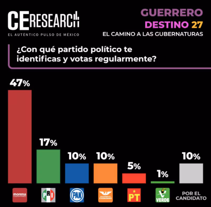Los datos de C&E Research confirman la tendencia: Morena lidera en 11 estados, entre ellos Guerrero (47%), Tlaxcala (45%), Sinaloa (42%) y Michoacán (40%).