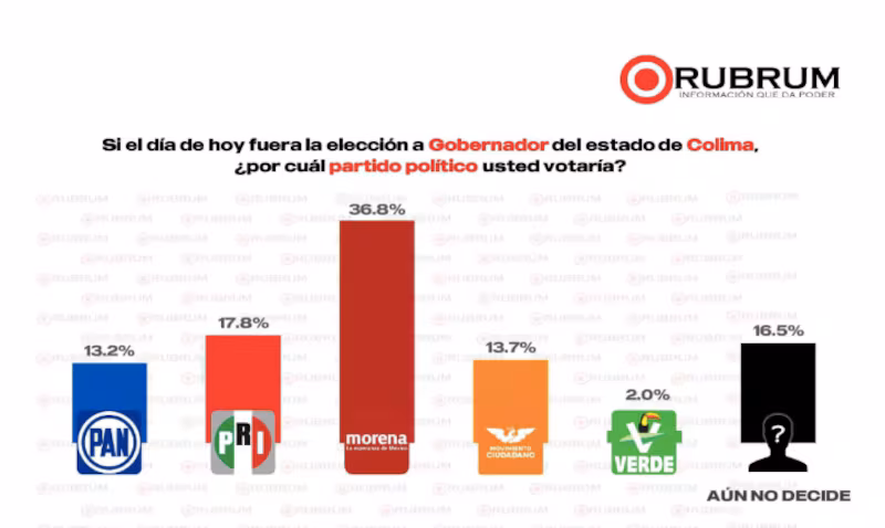 Los ejercicios de Rubrum colocan a Morena arriba en 13 de las 17 entidades, con ventajas claras en estados como Guerrero (46.7%), Campeche (44.2%), Quintana Roo (47.5%), Chihuahua (37.4%) y Colima (36.8%) mientras que el PAN se impone únicamente en Querétaro (47.4%) y Aguascalientes (51.7%).