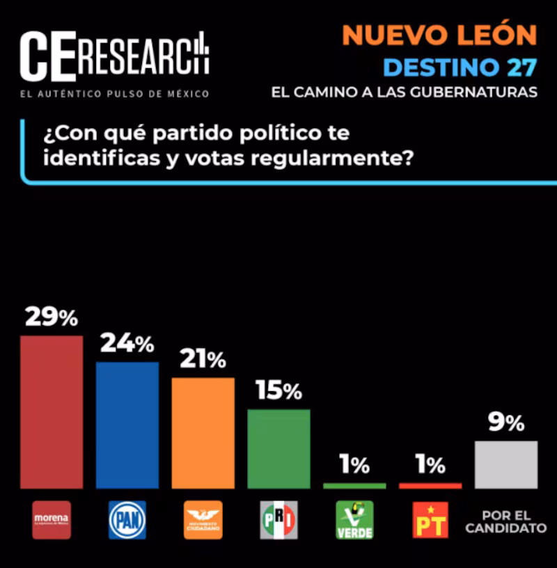 En contraste, Movimiento Ciudadano se mantiene competitivo en Nuevo León (19%) y con más de 10 puntos en Campeche y Tlaxcala.