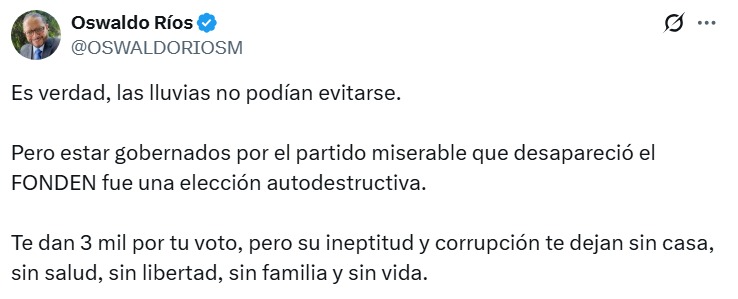 “Lo que está pasando en Veracruz es una vergüenza… Es indignante ver cómo Morena se burla del sufrimiento del pueblo, cómo desprecian a las familias damnificadas con una frialdad y una soberbia que lastiman”.