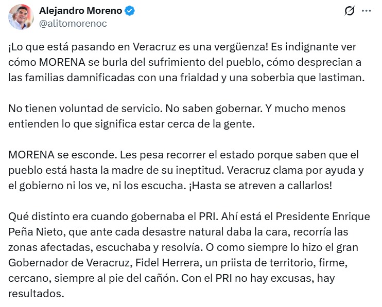 Uno de los primeros fue el dirigente nacional del Partido Revolucionario Institucional (PRI), Alejandro Moreno Cárdenas, quien calificó la situación como una “vergüenza” y acusó a Morena de “burlarse del sufrimiento del pueblo”.