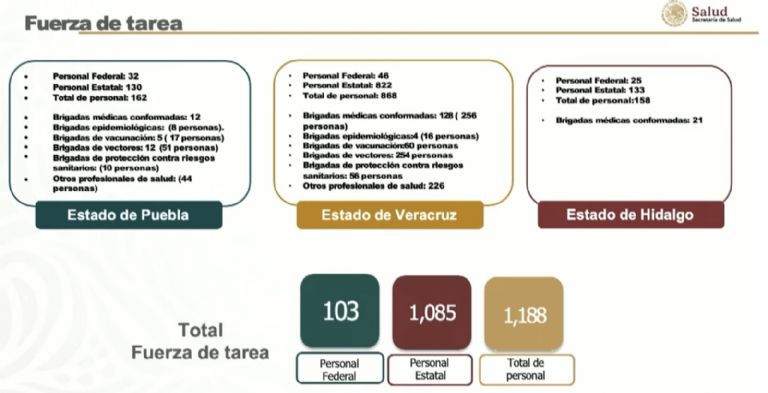 Apuntó que en Puebla son el Personal Federal, son 32, y Personal estatal, 130, además de que las brigadas son médicas, epidemiológicas, de vacunación, de vectores y de protección contra riesgos sanitarios, y otros profesionales de la salud que están disponibles para distintas acciones. Añadió que en Veracruz están 46 personas federales, 822 de personal Estatal, un total de 868 personas.