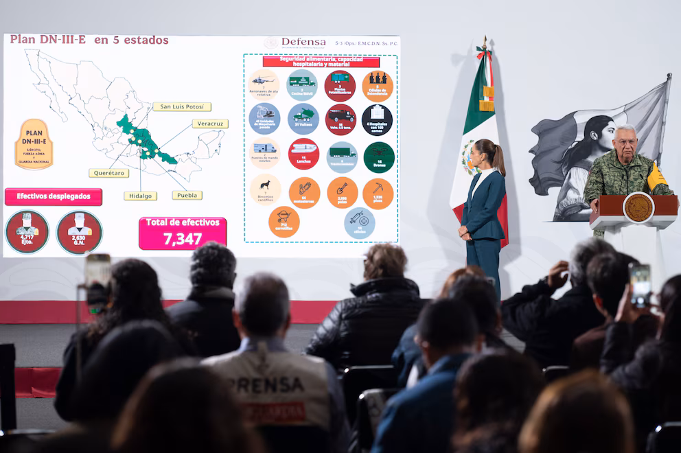Asimismo, el general Ricardo Trevilla Trejo, informó que desde la madrugada del jueves 9 de octubre que se desplegó el Plan DN-III E con apoyo del Ejército Mexicano, la Fuerza Aérea y la Guardia Nacional donde en total, se desplegaron: