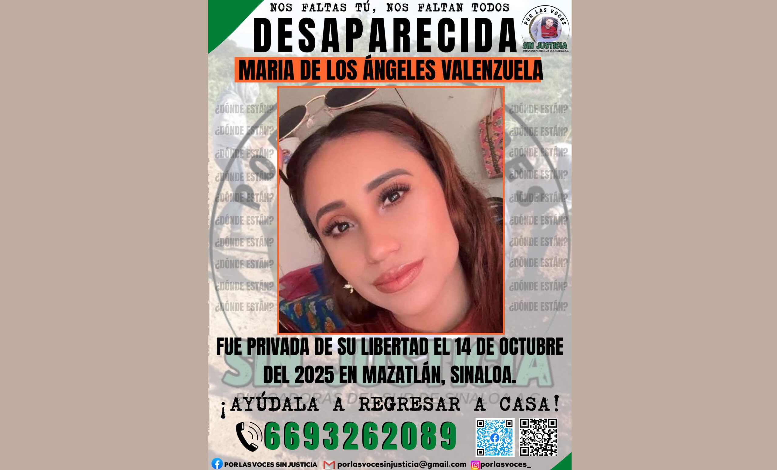 Mazatlán, Sin (RI Noticias).- María de los Ángeles Valenzuela activista y rastreadora del colectivo de búsqueda de personas desaparecidas Por las Voces sin Justicia fue privada de la libertad esta tarde en la colonia Salvador Allende.