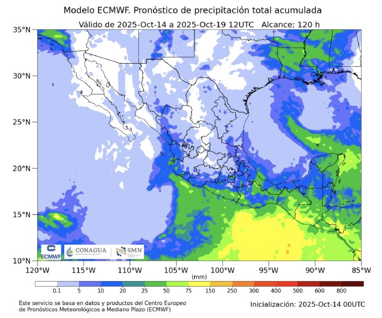 En cuanto a las lluvias, se espera que sean muy fuertes con puntuales intensas en Chiapas, Oaxaca y Quintana Roo, mientras que las lluvias fuertes con puntuales muy fuertes se pronostican para: