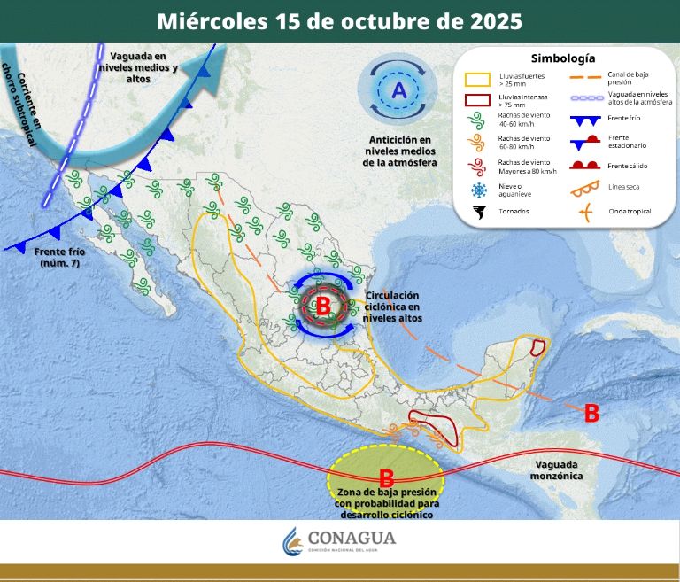 Ante ello, te compartimos el pronóstico que se espera en diversos estados en los que durante las primeras horas de esta mitad de semana se verán afectados por la entrada de este frente frío número 7, que, en combinación con una vaguada en altura, las corrientes en chorro polar y subtropical, canales de baja presión y una circulación ciclónica en altura, afectarán el clima.