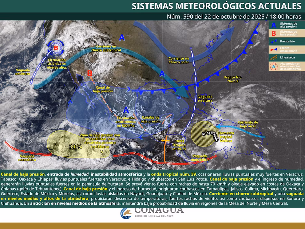 Las condiciones atmosféricas también propiciarán vientos con rachas de hasta 70 km/h y oleaje elevado en las costas de Oaxaca y Chiapas, particularmente en el golfo de Tehuantepec. La presencia de la onda tropical número 39 reforzará la probabilidad de lluvias en el sur de Chiapas.