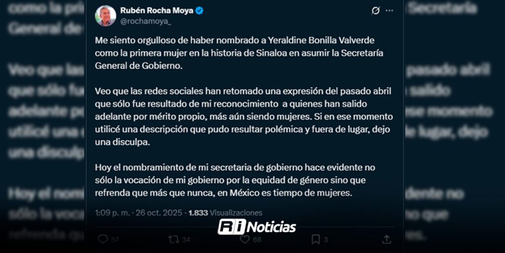 Culiacán, Sinaloa (Ri Noticias).– El gobernador de Sinaloa, Rubén Rocha Moya, difundió un comunicado en el que expresó sentirse orgulloso por haber designado a Yeraldine Bonilla Valverde como la primera mujer en la historia del estado en ocupar la Secretaría General de Gobierno.