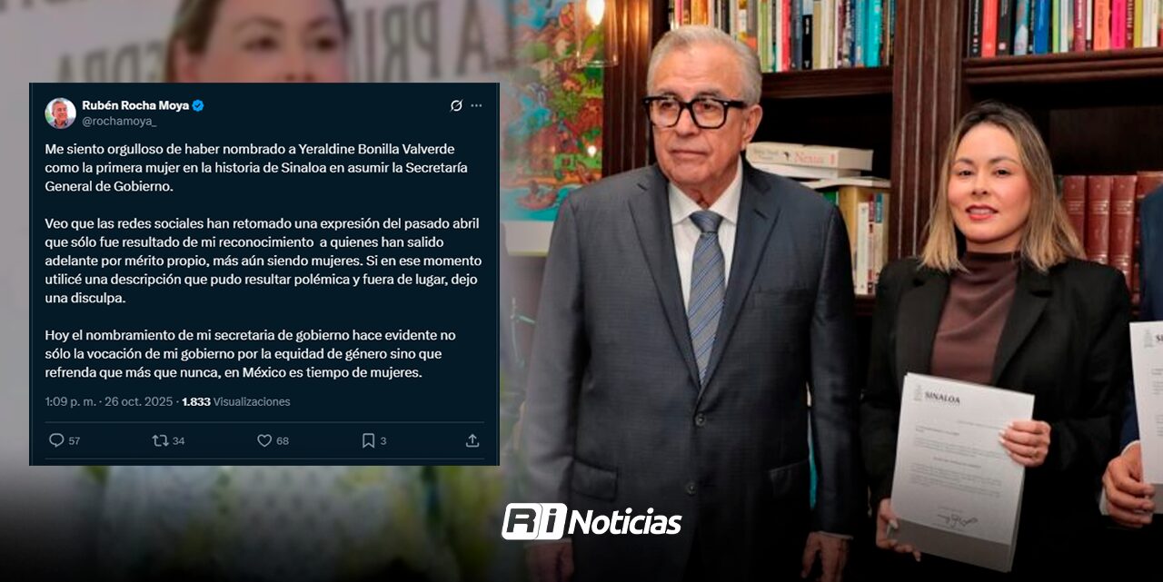 Culiacán, Sinaloa (Ri Noticias).– El gobernador de Sinaloa, Rubén Rocha Moya, difundió un comunicado en el que expresó sentirse orgulloso por haber designado a Yeraldine Bonilla Valverde como la primera mujer en la historia del estado en ocupar la Secretaría General de Gobierno.