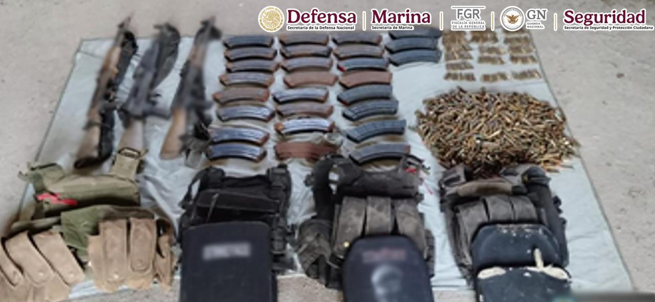 En tanto, se aseguraron tres armas largas, cartuchos útiles, 18 cargadores, seis artefactos explosivos improvisados, una granada, dos chalecos, un uniforme táctico y un vehículo.