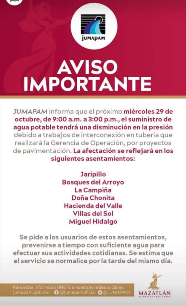Mazatlán, Sinaloa (RI Noticias). – Debido a trabajos de interconexión de tuberías relacionados con proyectos de pavimentación, la Junta Municipal de Agua Potable y Alcantarillado de Mazatlán (Jumapam) informó que varias zonas del puerto experimentarán una interrupción temporal del servicio de agua potable este miércoles 29 de octubre.