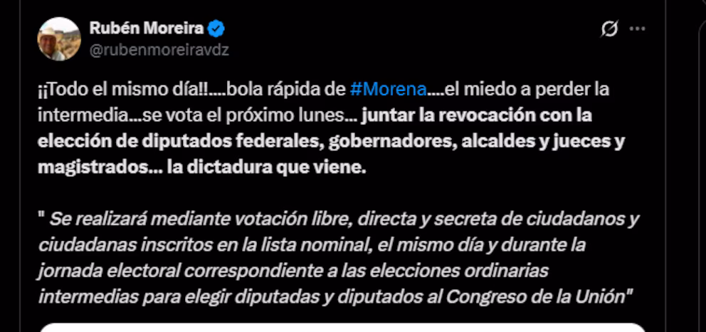 “El miedo a perder la intermedia… se vota el próximo lunes… juntar la revocación con la elección de diputados federales, gobernadores, alcaldes y jueces y magistrados… la dictadura que viene”, escribió Moreira en la red social X.