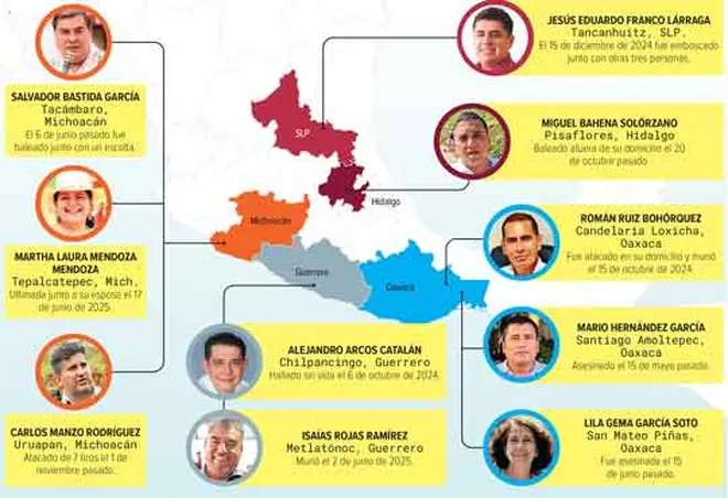 Martha Laura Mendoza Mendoza (Tepalcatepec, Michoacán (Morena). Fue asesinada junto a su esposo el 17 de junio de 2025, en un ataque armado frente a su domicilio en el centro del municipio. Un hijo de la pareja resultó gravemente herido. Miguel Bahena Solórzano (Pisaflores, Hidalgo/ PVEM). Fue baleado afuera de su domicilio la noche del 20 de octubre pasado, por dos sicarios que luego huyeron en moto, en la localidad de La Estancia.