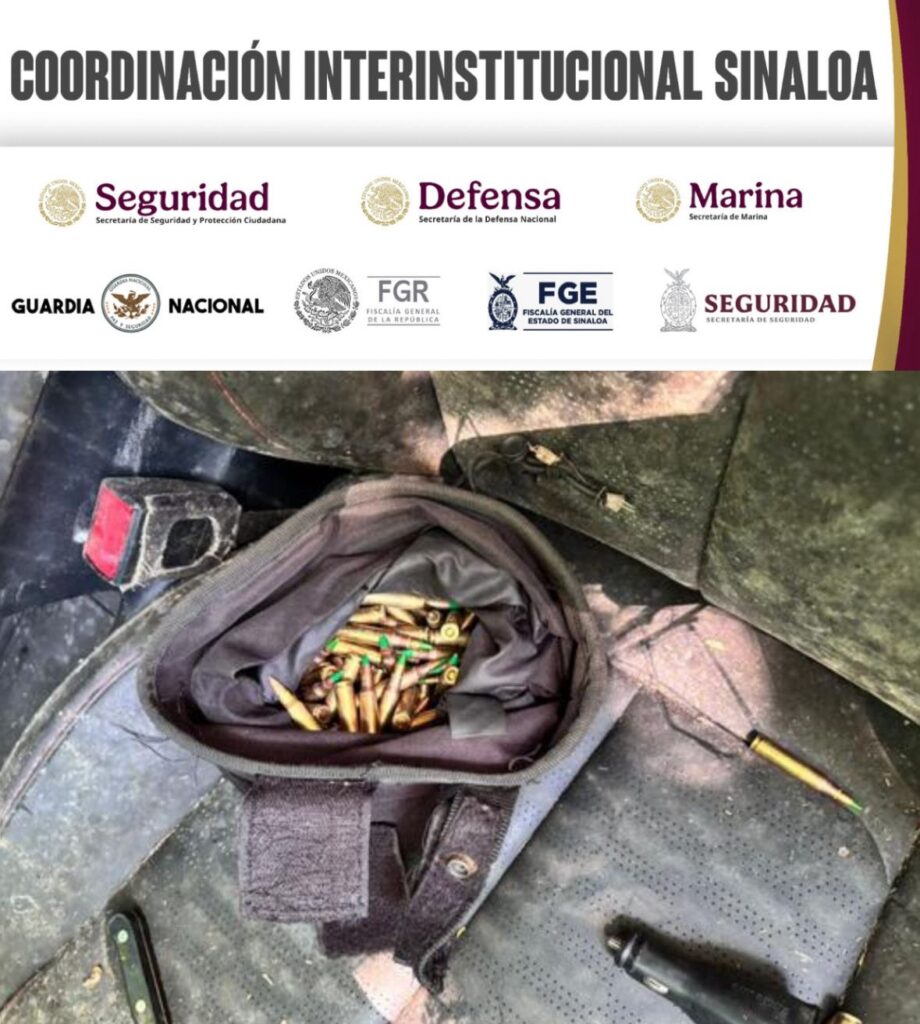 Concordia, Sin (RI Noticias). – Elementos del Ejército Mexicano, en coordinación con la Guardia Nacional, la Secretaría de Marina, la Secretaría de Seguridad y Protección Ciudadana, la Fiscalía General de la República, la Fiscalía General del Estado y la Secretaría de Seguridad Pública de Sinaloa, a través de la Policía Estatal Preventiva, aseguraron una camioneta con reporte de robo, cargadores, cartuchos y equipo táctico en el municipio de Concordia.