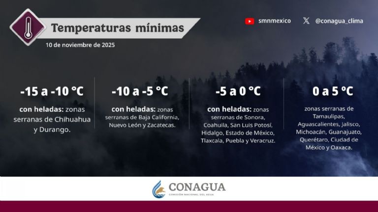 Para hoy lunes 10 de noviembre durante el día, especialmente en la tarde y la noche, la Coordinación Nacional de Protección Civil, informó que estos serán los estados cuyas zonas serranas registren temperaturas de -15 a 10 grados centígrados, con heladas y probabilidad de caída de nieve o aguanieve: