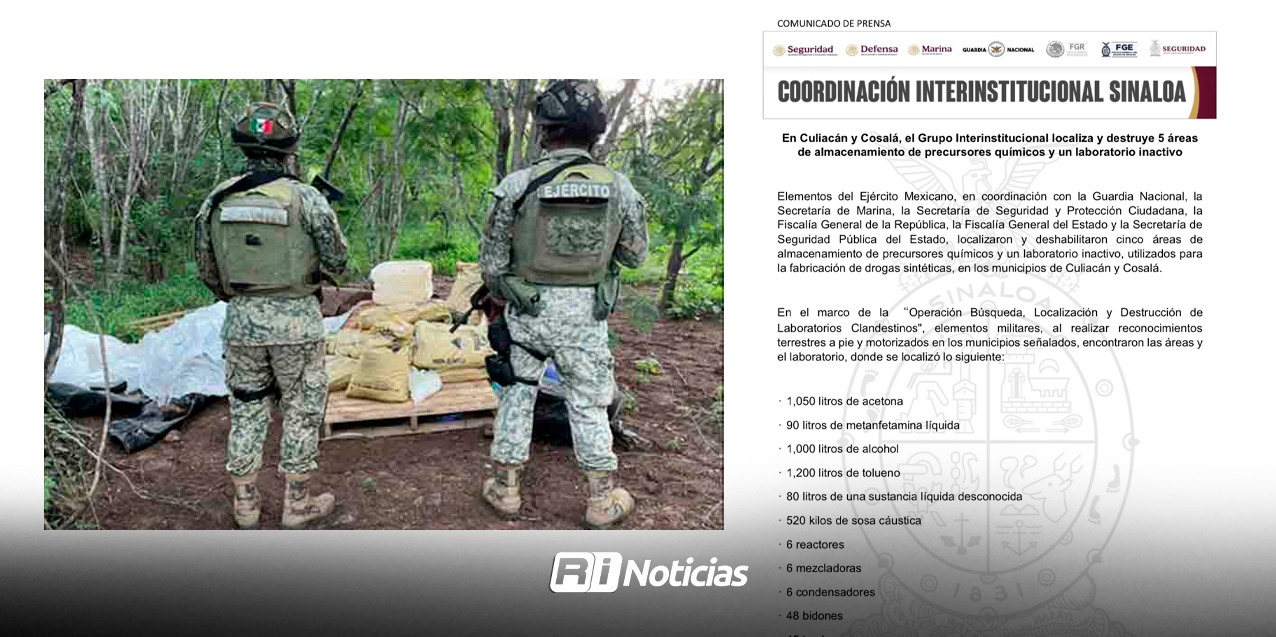 Culiacán, Sin (RI Noticias).- Elementos del Ejército Mexicano, en coordinación con la Guardia Nacional, la Secretaría de Marina, la Secretaría de Seguridad y Protección Ciudadana, la Fiscalía General de la República, la Fiscalía General del Estado y la Secretaría de Seguridad Pública del Estado, localizaron y deshabilitaron cinco áreas de almacenamiento de precursores químicos y un laboratorio inactivo, utilizados para la fabricación de drogas sintéticas, en los municipios de Culiacán y Cosalá.