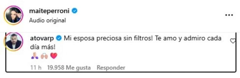 “Mi esposa preciosa sin filtros. Te amo y admiro cada día más”, escribió.