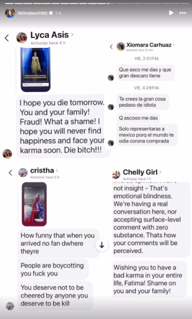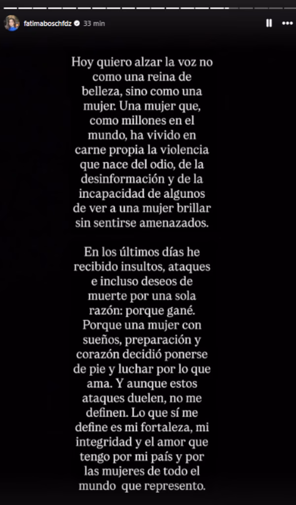 “En los últimos días he recibido insultos, ataques y violencia que tienen por una sola razón: porque gané. Porque una mujer con sueños, preparación y corazón decidió ponerse de pie y luchar por lo que ama. Y aunque estos ataques no me definen, lo que sí me define es mi fortaleza, mi integridad y el amor que tengo por mi país y por las mujeres de todo el mundo que represento”, continuó.