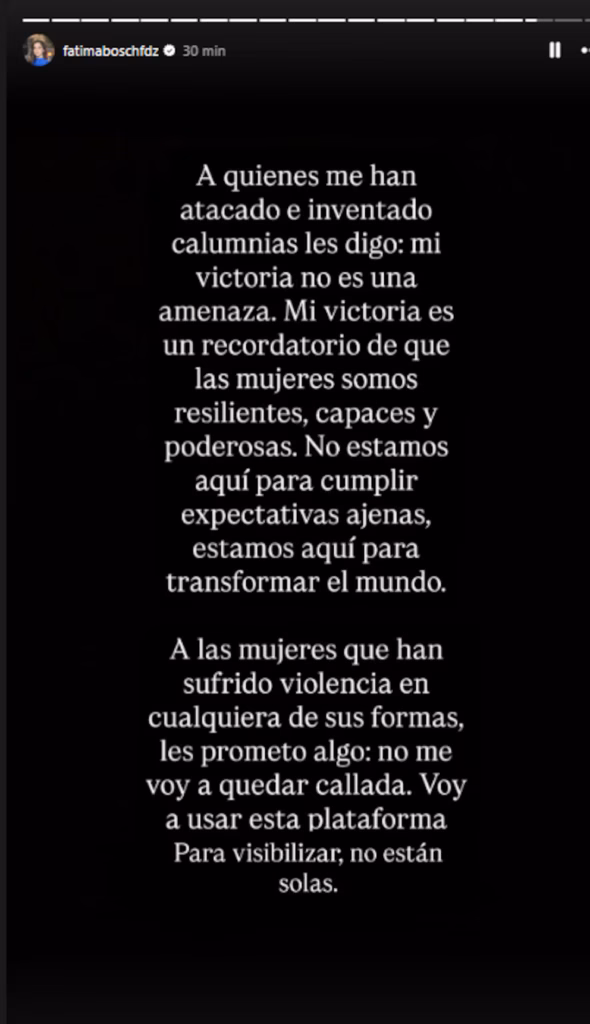 “A quienes me han atacado e inventado calumnias les digo: mi victoria no es una amenaza. Mi victoria es un recordatorio de que las mujeres somos resilientes, capaces y poderosas. No estamos aquí para cumplir expectativas ajenas, estamos aquí para transformar el mundo”, escribió.
