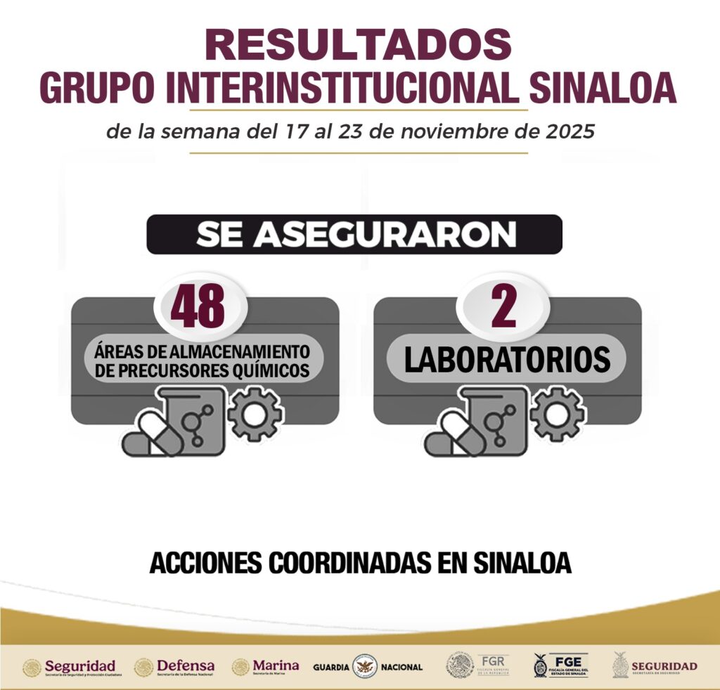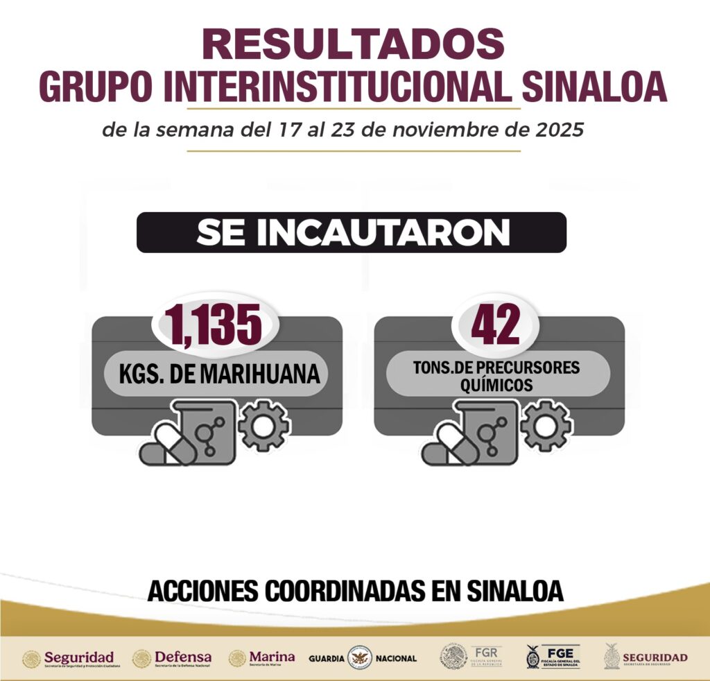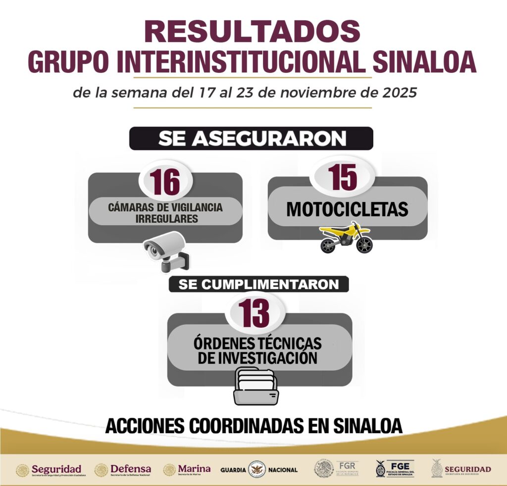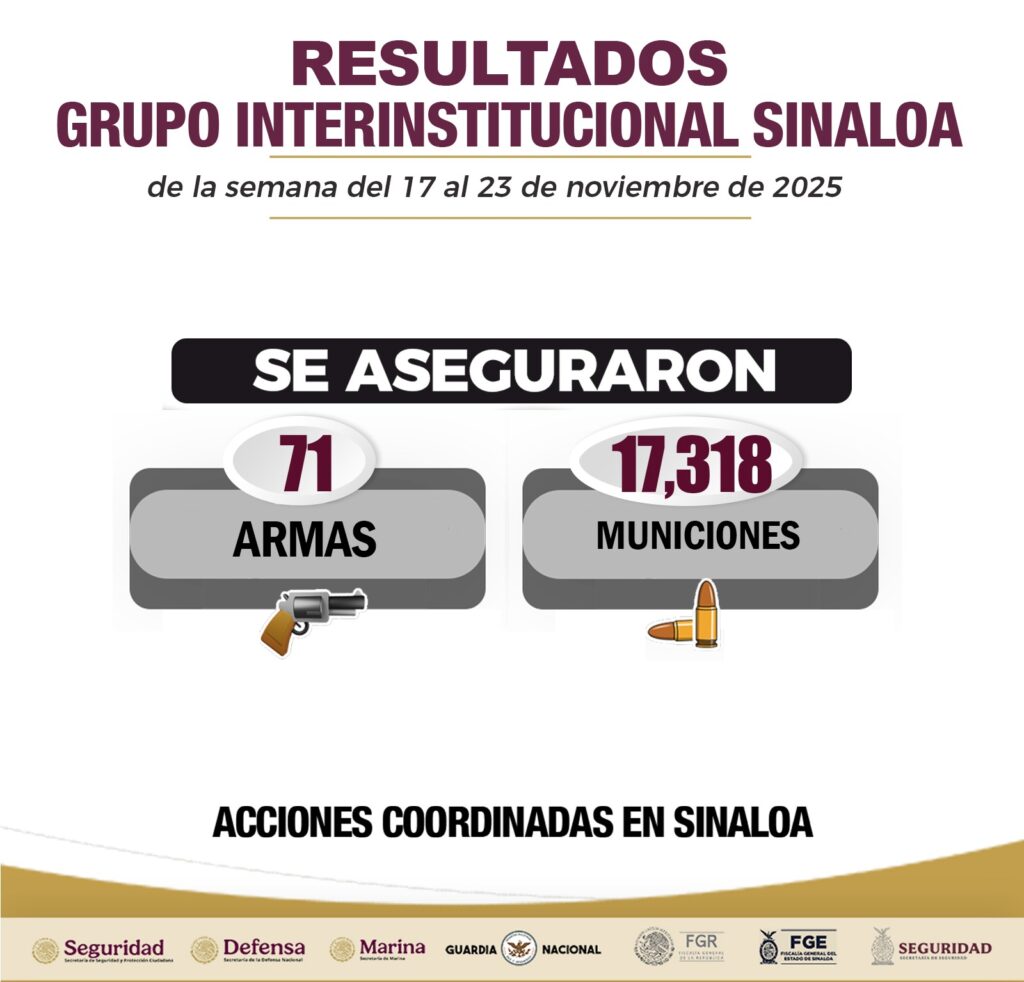 Culiacán, Sinaloa (RI Noticias). – Entre el 17 y el 23 de noviembre de 2025, diferentes corporaciones de seguridad federales, estatales y municipales, realizaron operativos en varios municipios de Sinaloa que dejaron como resultado múltiples detenciones y aseguramientos.