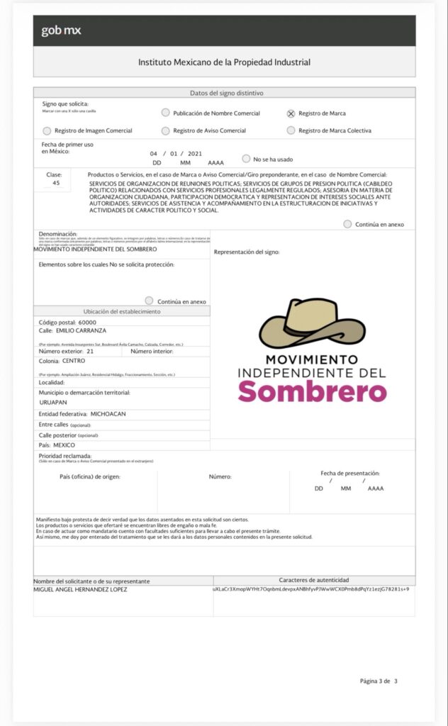 “El pasado 14 de noviembre Grecia Quiroz, alcaldesa de Uruapan, ingresó al IMPI la solicitud de registro de marca de Carlos Manzo y de Movimiento Independiente del Sombrero. Dichas solicitudes se encuentran en análisis y acompañaremos su proceso hasta la resolución de las mismas”, escribió el funcionario.