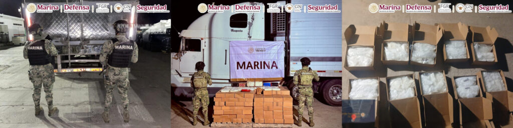 Mazatlán, Sinaloa (Ri Noticias).- En un operativo conjunto realizado en el Recinto Portuario de Mazatlán, personal de la Marina y la Fiscalía General de la República aseguró más de 600 kilos de metanfetamina que eran transportados en un tractocamión. La revisión fue hecha por elementos de la Unidad Naval de Protección Portuaria, quienes detectaron un doble fondo en la unidad.