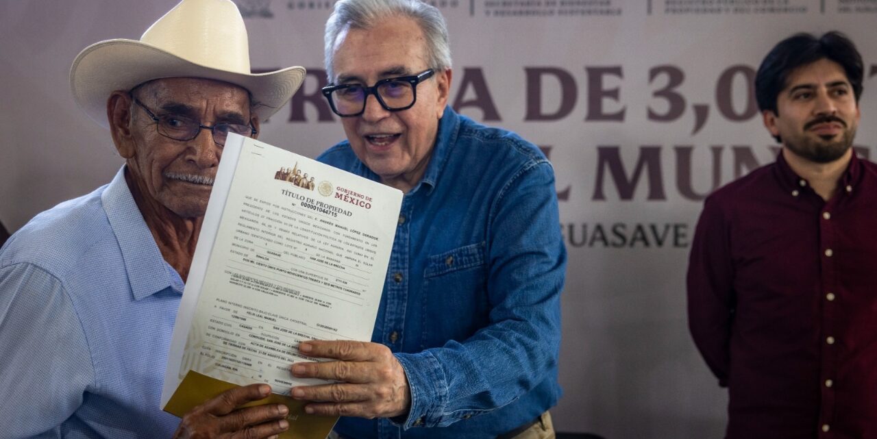 Guasave, Sinaloa. – En un acto que consideró de elemental justicia social, el gobernador Rubén Rocha Moya hizo entrega a 3 mil 16 familias de sus títulos de propiedad, documentos que les otorgan la certeza jurídica de su patrimonio, las cuales radican en 42 núcleos ejidales y zonas urbanas del municipio de Guasave.