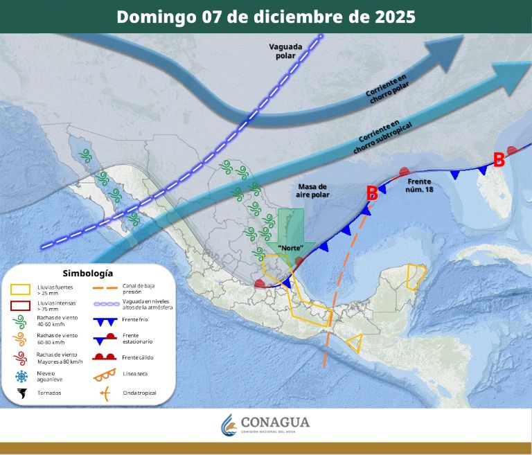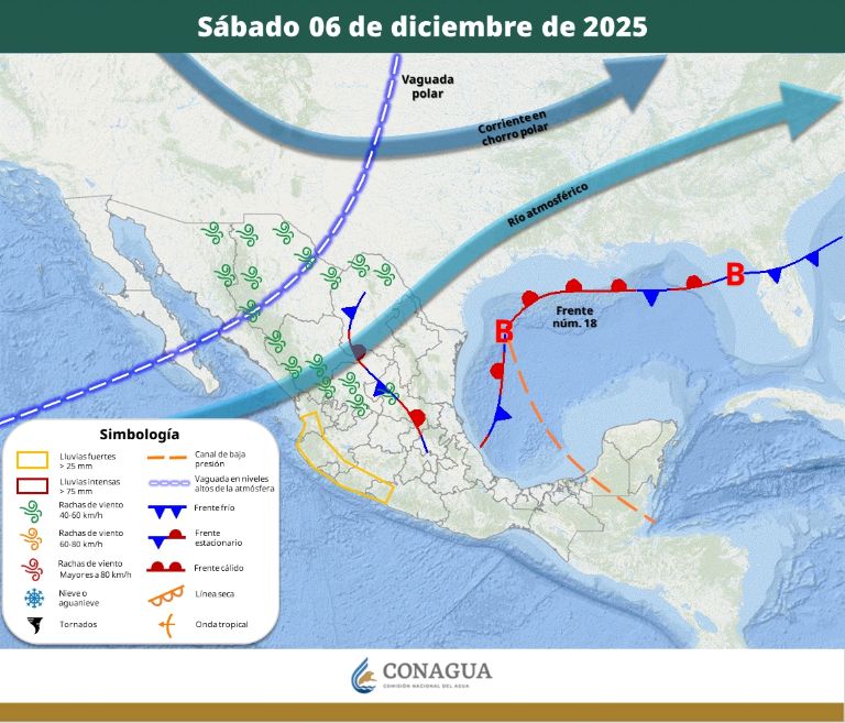 El sábado, el frente frío número 18 se extenderá como estacionario sobre el oriente del país, mientras que la vaguada en niveles medios y altos de la atmósfera continuará sobre el noroeste de la República Mexicana y el río atmosférico persistirá desde el occidente hasta el noreste del territorio nacional, originando ambiente frío a muy frío, chubascos y lluvias puntuales fuertes en las regiones mencionadas.