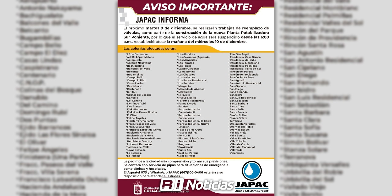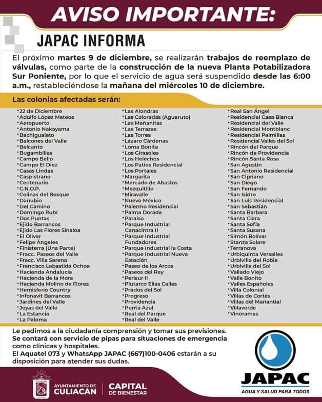Culiacán, Sinaloa (RI Noticias). – La Junta de Agua Potable y Alcantarillado de Culiacán informó que este martes 9 de diciembre se suspenderá el servicio de agua en 107 colonias del sector sur a partir de las 6:00 horas. La medida se toma como parte de las labores que se realizan en la nueva Planta Potabilizadora que se construye al sur poniente de la ciudad.