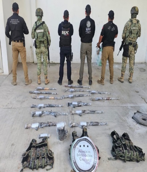 Tras obtener la orden de cateo por parte de la Fiscalía General de la República, los efectivos del Ejército Mexicano en coordinación con elementos de la Secretaría de Seguridad y Protección Ciudadana ingresaron al inmueble en donde encontraron 100 artefactos explosivos de fabricación casera, así como 14 armas largas, cargadores y cartuchos útiles.