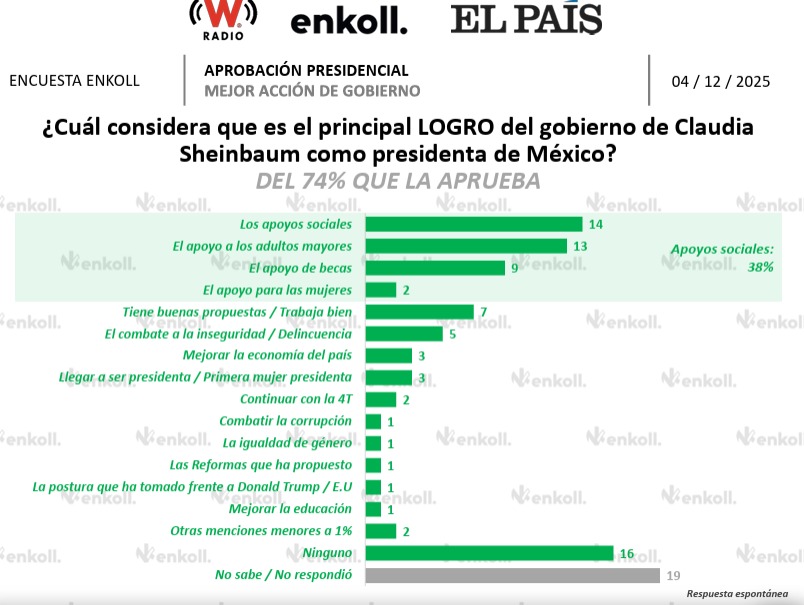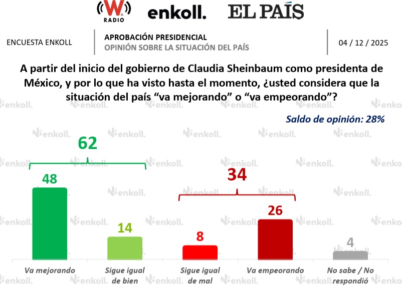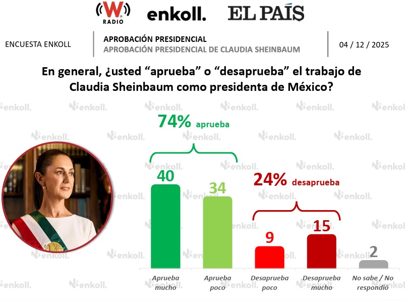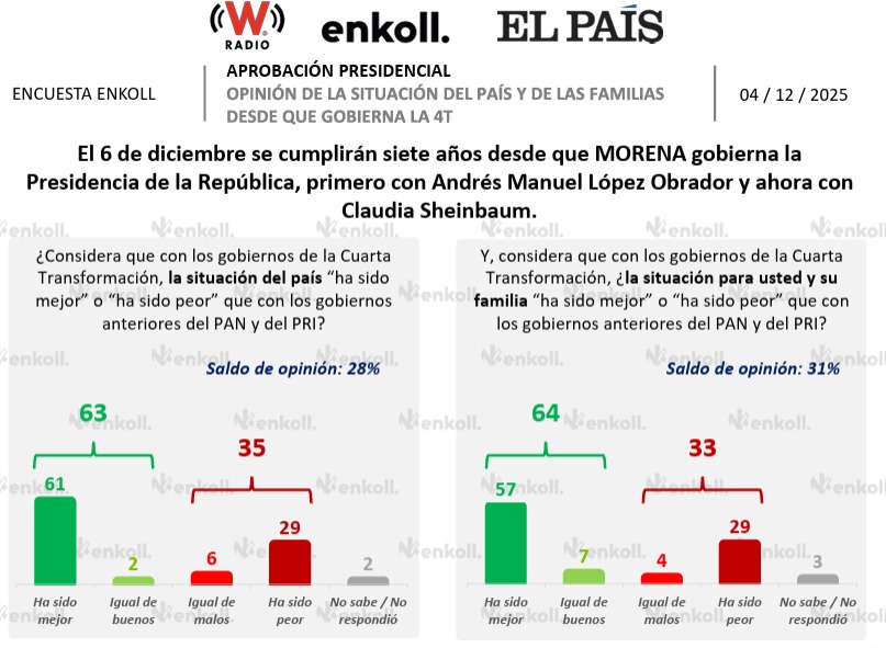 Aunque el ejercicio de su administración avanza y enfrenta retos naturales del cargo, los datos muestran una estabilidad política significativa y una percepción favorable sobre el rumbo del país, de acuerdo con la encuesta nacional realizada por Enkoll para el diario El País, lo que demuestra que la ciudadanía continúa confiando en los gobiernos encabezados por el movimiento denominado como Cuarta Transformación.