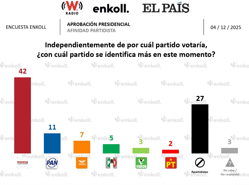 Por otro lado, un 27 por ciento se declara apartidista, pero reconoce avances en programas sociales y políticas públicas. Las fuerzas opositoras registran porcentajes modestos, el PAN, un once por ciento; Movimiento Ciudadano, un siete por ciento; y el PRI, un cinco por ciento, mientras que los partidos aliados, PVEM y PT, cuentan con tres y dos por ciento respectivamente.
