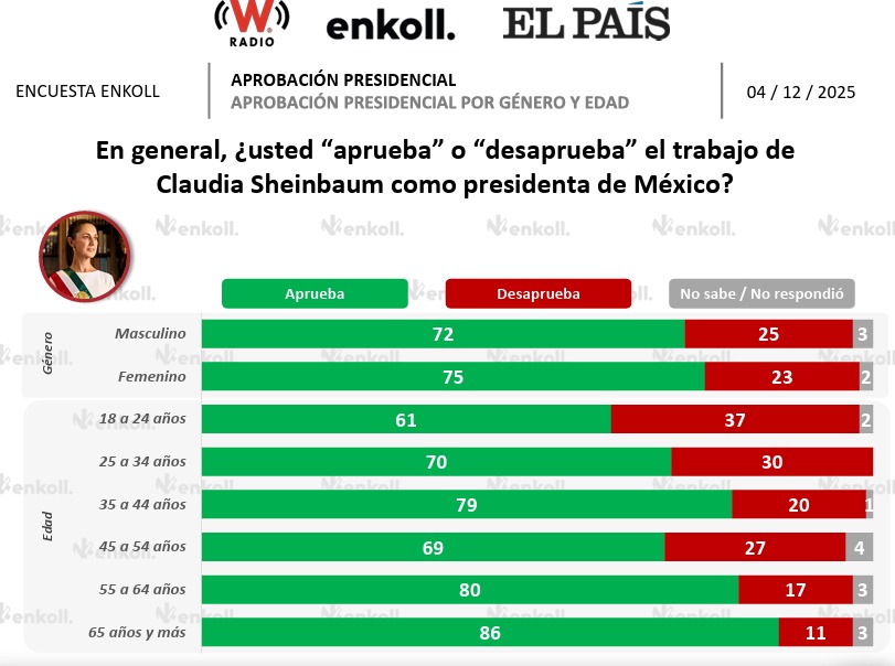 Entre jóvenes de dieciocho a 24 años, un 61 por ciento aprueba su gestión, reflejo de una conexión vigente con las nuevas generaciones. En el sector de 55 a 64 años, la aprobación asciende al 80 por ciento, y entre personas de 65 años y más alcanza un sólido 86 por ciento, impulsada en gran parte por los beneficios sociales implementados por el gobierno federal, especialmente la pensión universal para adultos mayores.