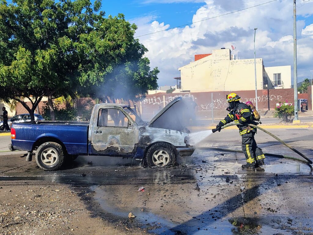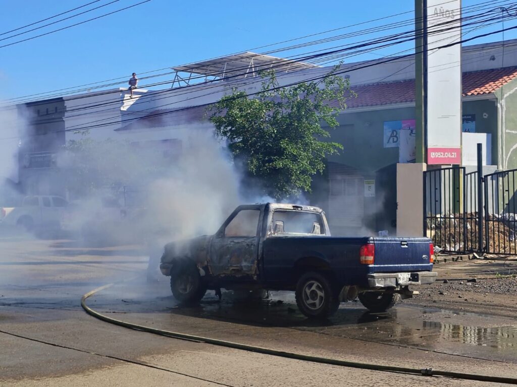Ahi una camioneta Ford sufrió una falla eléctrica por lo que se empezó a incendiar de la parte del motor.