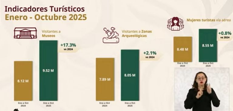 En presencia de la presidenta Claudia Sheinbaum, la funcionaria informó la llegada de visitantes internacionales: 8.3 millones hasta octubre de 2025, un aumento del 10.7 por ciento respecto al mismo periodo del año previo.