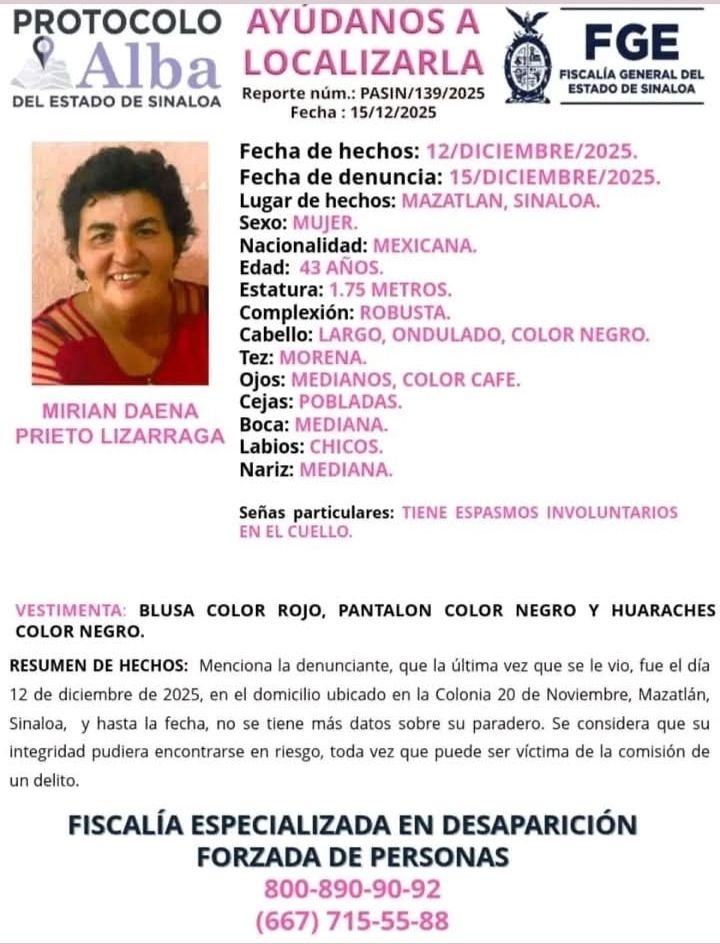 Mazatlán, Sin (RI Noticias).- La Fiscalía General del Estado emitió la noche del 15 de diciembre fichas de búsqueda del Protocolo Alba por la desaparición de tres mujeres este fin de semana en el puerto de Mazatlán.