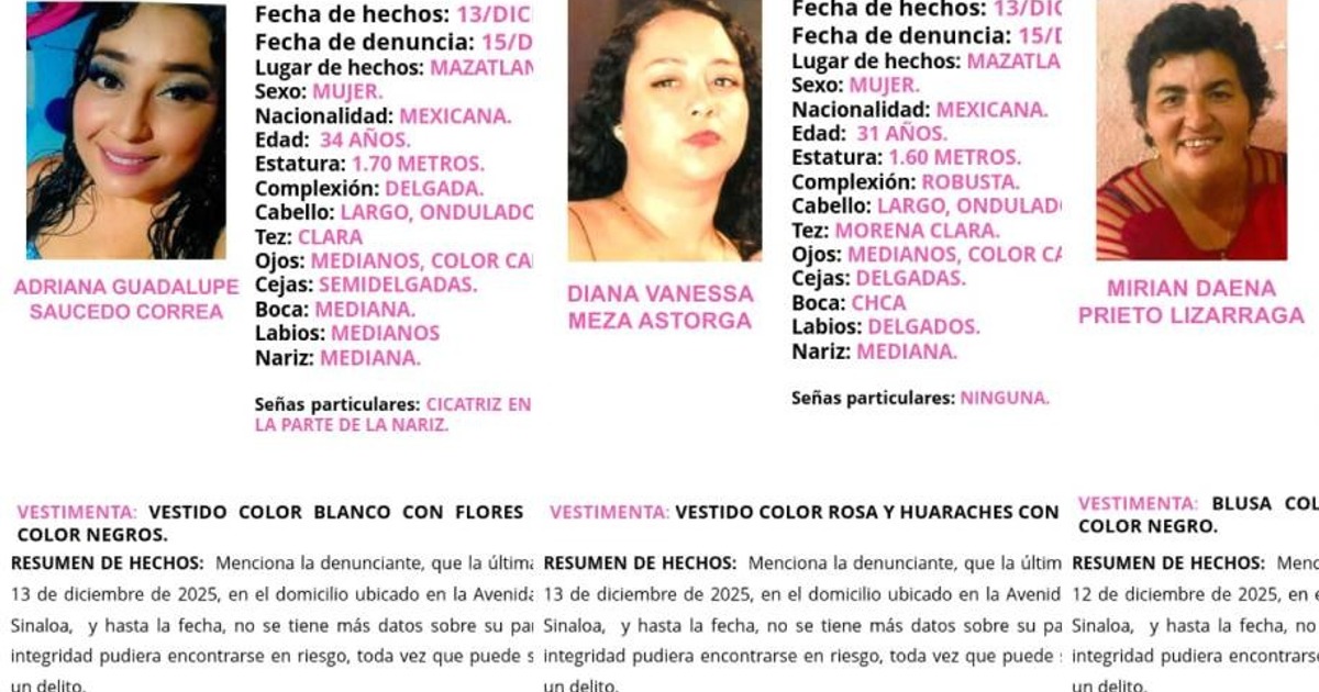 Mazatlán, Sin (RI Noticias).- La Fiscalía General del Estado emitió la noche del 15 de diciembre fichas de búsqueda del Protocolo Alba por la desaparición de tres mujeres este fin de semana en el puerto de Mazatlán.