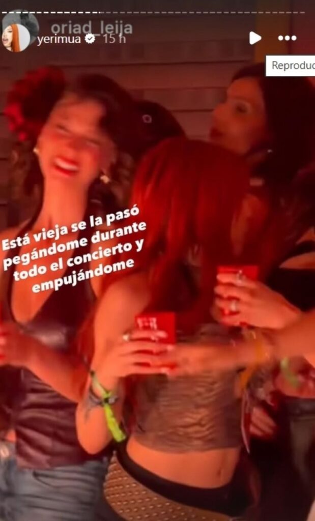 Yeri Mua fue una de las invitadas especiales para el concierto del 16 de diciembre y dijo que un día de fiesta terminó siendo muy incómodo y culpó a la mujer que estaba a su lado, quien ha sido identificada, por los videos como Carolina Miranda. Además dio detalles de cómo la empezó a molestar.“Esta vieja de pelo chino, durante todo el concierto de Bad Bunny, se la pasó empujándome y metiéndome el pie para que me cayera. O sea. De verdad no sé cuál era su problema pero desde que me vio se la pasaba molestándome, qué necesidad de estarme pegando y empujando todo el concierto”, dijo en sus stories de Instagram.