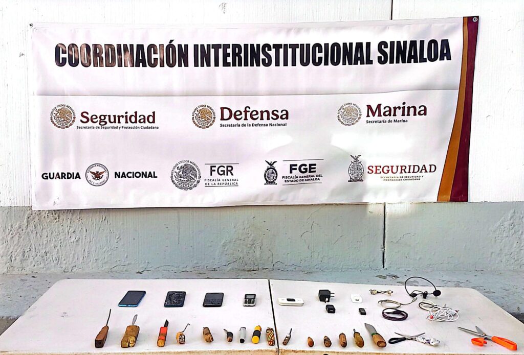 Ahome, Sin (RI Noticias).- Elementos de la Secretaría de Seguridad Pública de Sinaloa, a través de la Policía Estatal Preventiva, en coordinación con el Ejército Mexicano, la Guardia Nacional, la Secretaría de Marina, la Secretaría de Seguridad y Protección Ciudadana, la Fiscalía General de la República y la Fiscalía General del Estado, llevaron a cabo este viernes 19 de diciembre una revisión en un módulo del Centro Penitenciario Goros II, ubicado en el municipio de Ahome; aseguraron celulares, puntas y otros objetos prohibidos.