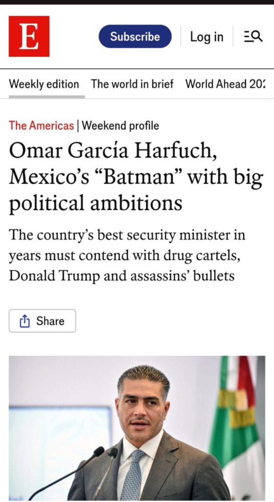 En su artículo, Omar García Harfuch, el Batman mexicano con aspiraciones políticas, The Economist define al secretario como el mejor que ha tenido el país en muchos años, destacando que ha logrado institucionalizar la inteligencia sobre la confrontación directa.