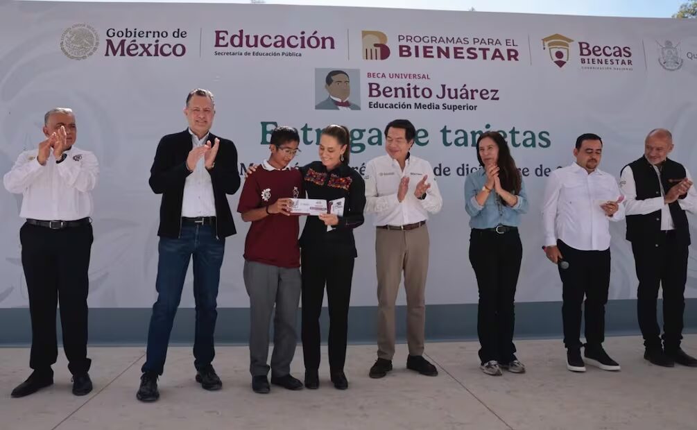 Durante la entrega de tarjetas de la beca Benito Juárez en el CBTIS 304 en construcción en El Marqués, Querétaro, Sheinbaum Pardo destacó avances en la creación de nuevos espacios educativos en todo el país, pero principalmente de preparatorias que queden cerca de las casas de quienes estudian.
