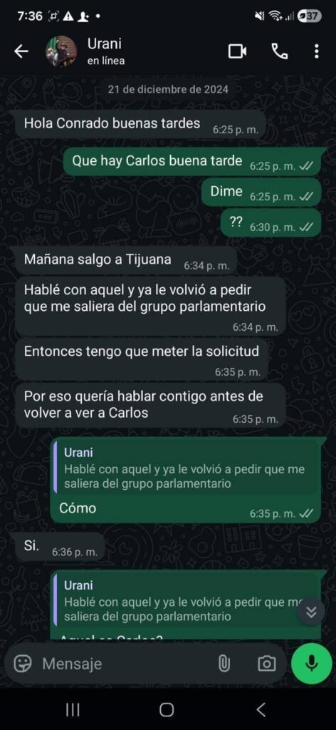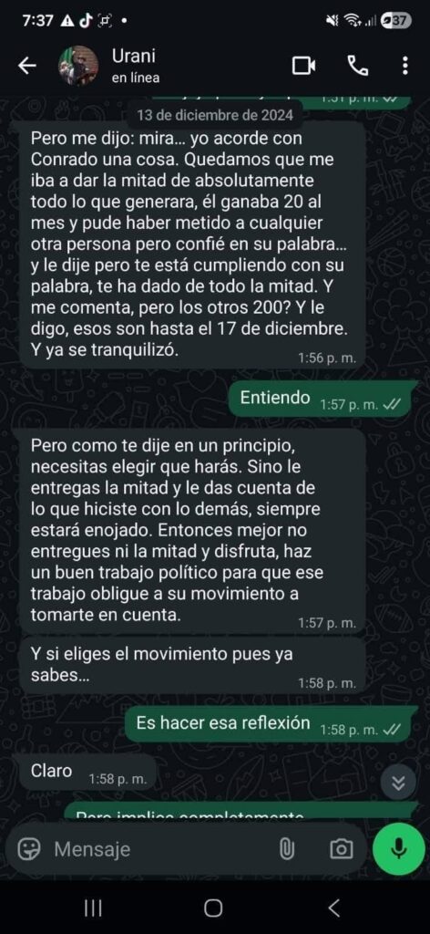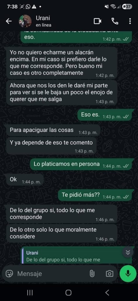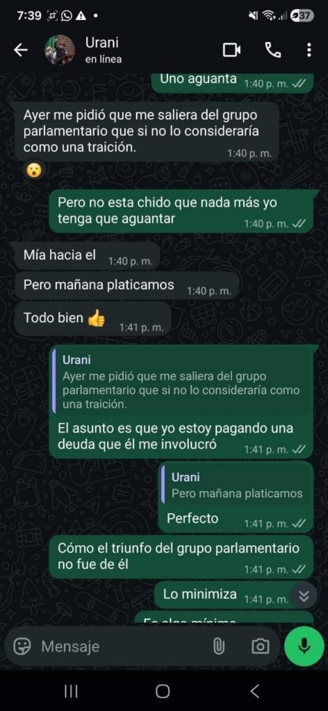 En los chats difundidos, también se menciona que permanecer dentro del movimiento implicaba seguir entregando recursos y aceptar condiciones que el diputado consideró incompatibles con el ejercicio de su función pública.