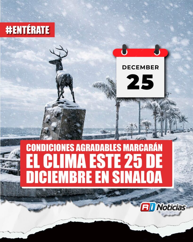 Mazatlán, Sinaloa (RI Noticias). – Durante este jueves 25 de diciembre, en el puerto de Mazatlán se espera un clima mayormente agradable, característico de la temporada invernal. Predominará un ambiente templado durante el día, con mañanas y noches ligeramente frescas, ideal para actividades al aire libre propias de las celebraciones navideñas.