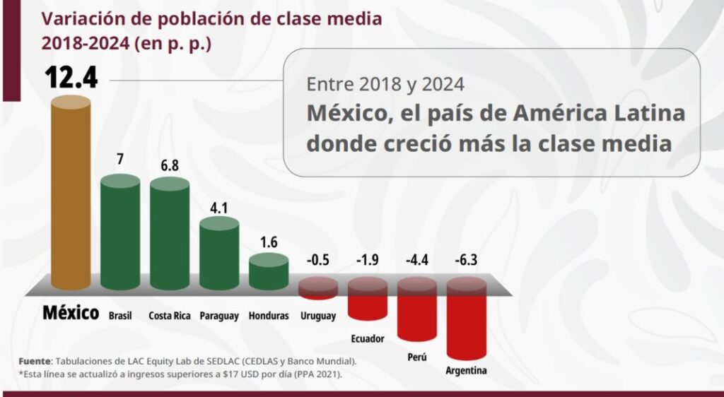 Asimismo, afirmó que México fue el país de América Latina donde más creció la clase media entre 2018 y 2024, de acuerdo con cifras del Centro de Estudios Distributivos, Laborales y Sociales (Cedlas) y del Banco Mundial.