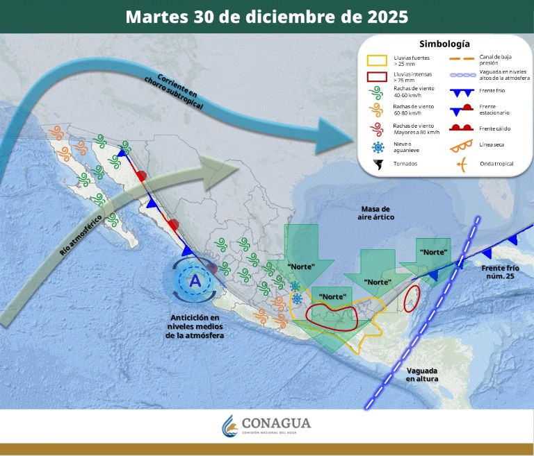 El frente frío número 25 se extenderá sobre la península de Yucatán, y continuará interaccionando con un río atmosférico y con una vaguada en altura, ocasionando lluvias puntuales torrenciales en zonas de Oaxaca, Veracruz y Tabasco, puntuales intensas en Chiapas, muy fuertes en Puebla, Campeche y Quintana Roo y lluvias fuertes en Yucatán.